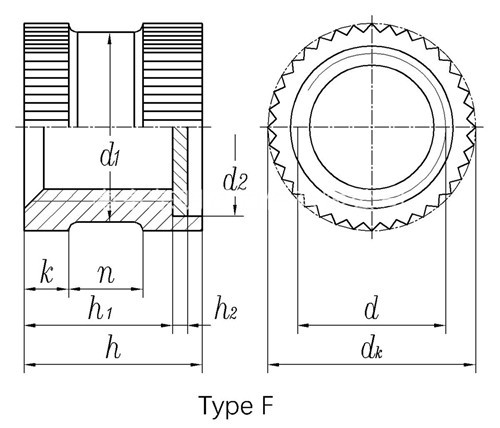 DIN 16903(F) - 1974 滚花通孔中间带槽镶入螺母 带密封垫 - F型