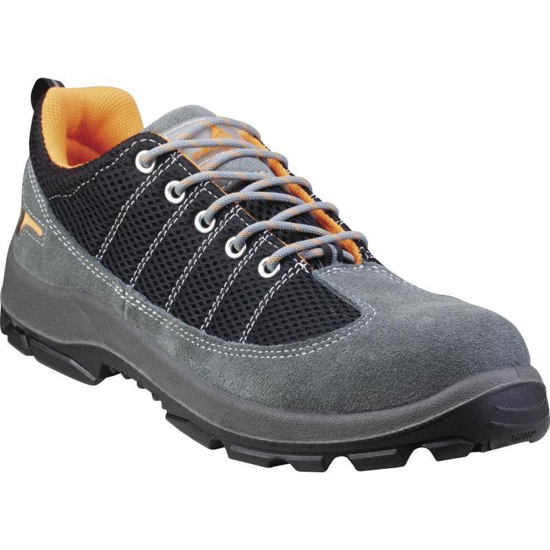 毛面牛皮及网面混合鞋面,双密度PU注塑鞋底,荧光色警示LOGO,防砸、防刺穿、防静电、耐磨、耐油。